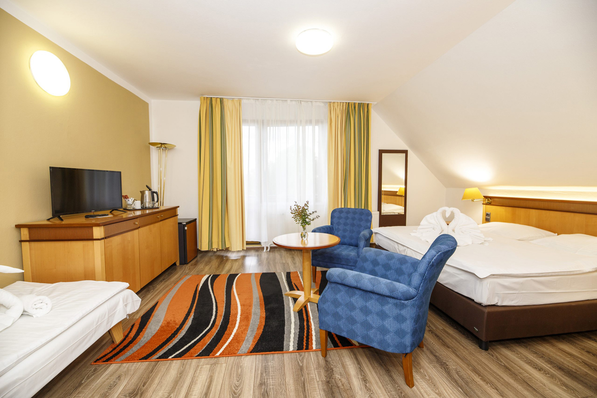 32 m² – izba s manželskou posteľou alebo 2 samostatnými lôžkami a 1 samostatným lôžkom, sociálne zariadenie, balkón