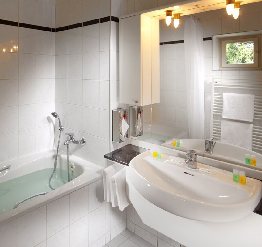 izba s jedným širokým lôžkom, sociálne zariadenie s vaňou alebo sprchou, umiestnenie izieb v zadnej časti do átria, s výhľadom do lesa