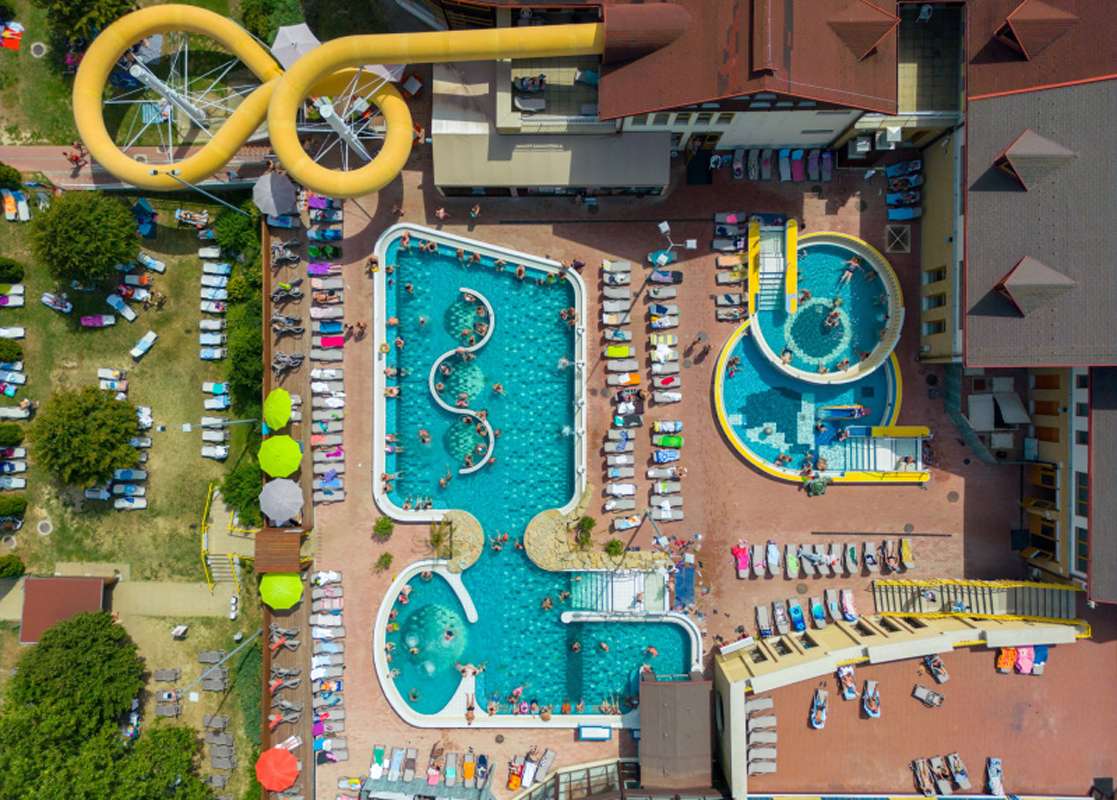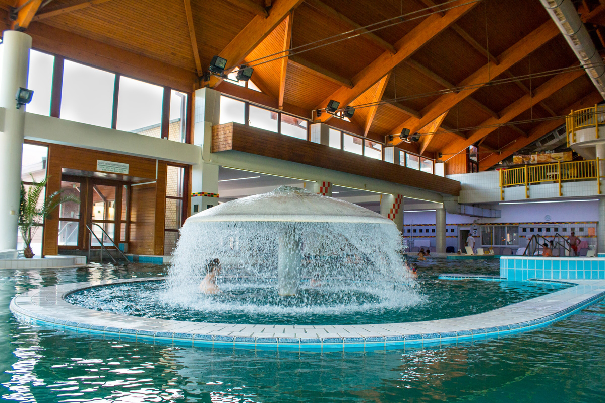 vstup do mestských kúpeľov Zalakaros (prepojené vykurovanou chodbou), v rámci kúpeľov vnútorné a vonkajšie bazény, termálne bazény, detské bazény, aquapark, veľká záhrada, posilňovňa, saunový svet*, liečebné terapie*, masáže*, hotel má v rámci mestských kúpeľov vlastnú vyhradenú záhradu s ležadlami, v kúpeľoch prebieha pravidelná údržba bazénov, vždy je však zaistená prevádzka väčšiny z nich
