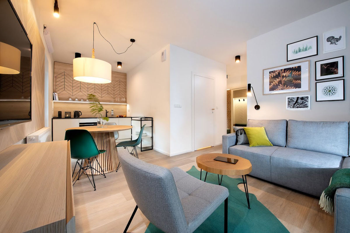 Smart TV sat., tablet s funkciou room service, sušič vlasov, trezor, wi-fi pripojenie na internet, župany a papuče do wellness, kozmetická súprava, žehlička a žehliaca doska, kuchynský kút s chladničkou, kávovar Nespresso, umývačka riadu (práčka v apartmánoch Grand)