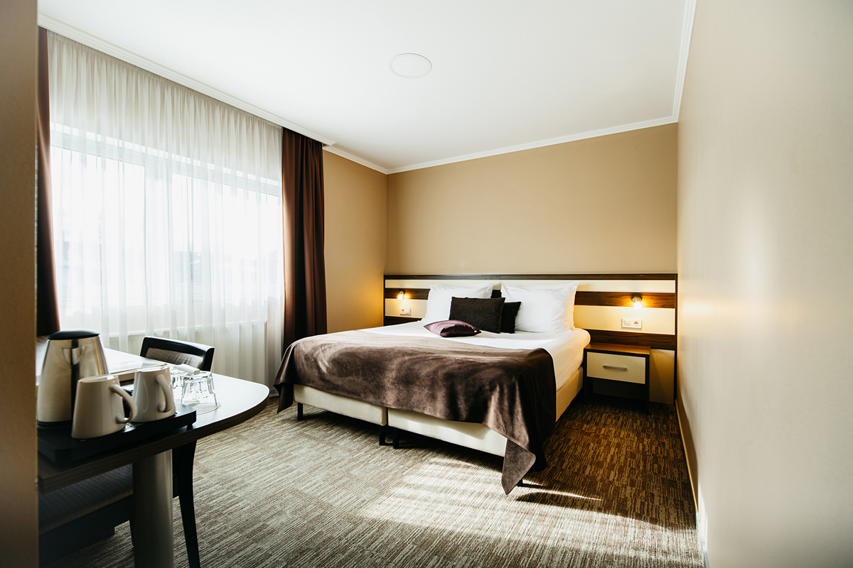 27 m² - izba s manželskou posteľou alebo 2 samostatnými lôžkami, sociálne zariadenie so sprchou alebo vaňou, balkón s výhľadom do parku