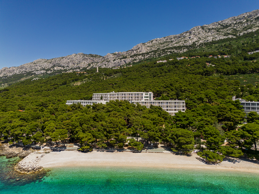 Brela, pláž Maestral / široká kamienková s pozvoľným vstupom do mora – 50 m, pláž Punta Rata – 400 m, centrum – 400 m, Baška Voda – 3 km, letisko Split – 70 km