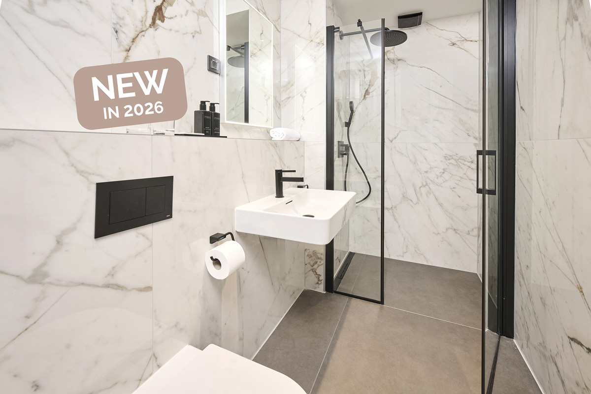 spálňa s manželskou posteľou, 2 izby s oddelenými lôžkami (90 × 210), obývacia miestnosť s plne vybaveným kuchynským kútom, 2 kúpeľne so sprchou, balkón