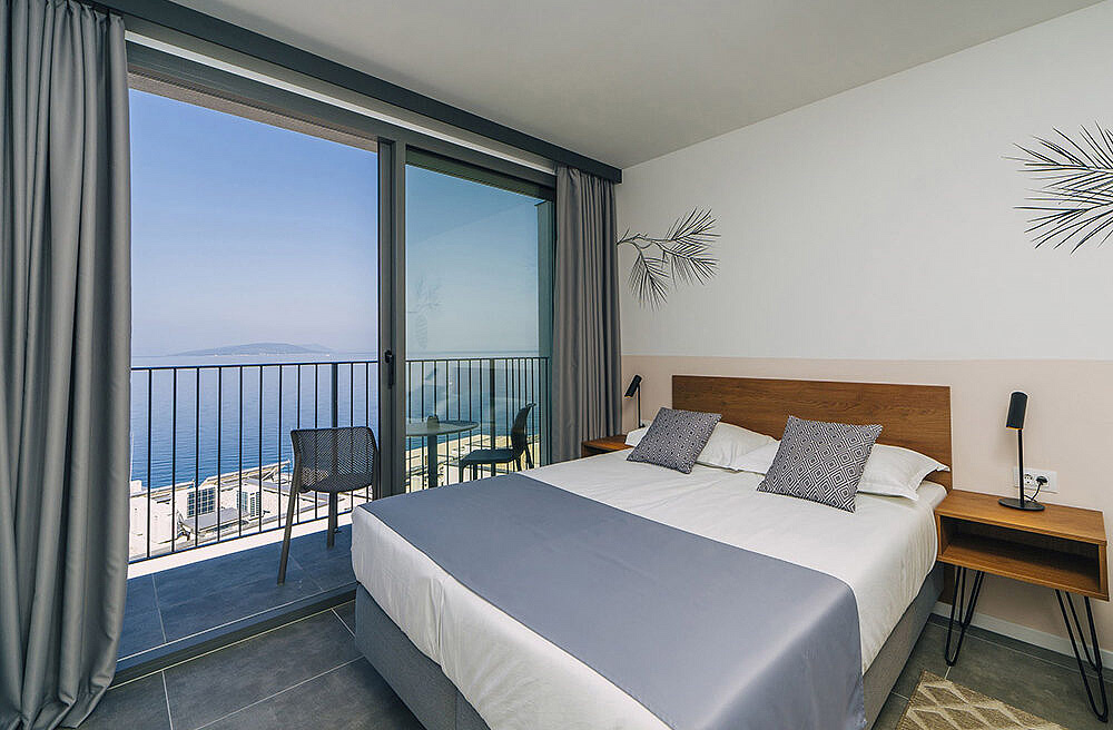 izba s manželskou posteľou či 2 samostatnými lôžkami, sociálne zariadenie so sprchou, balkón orientovaný na morskú stranu
