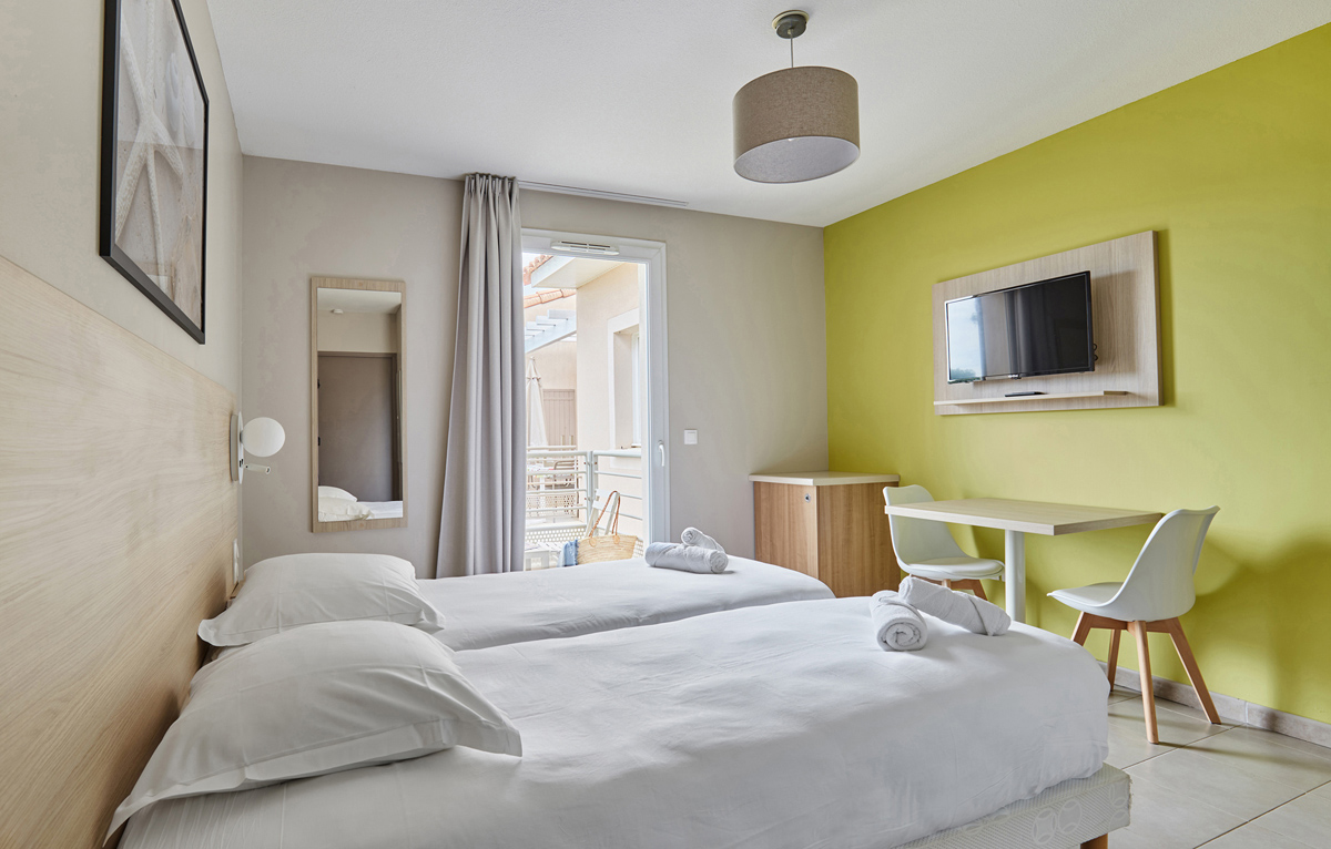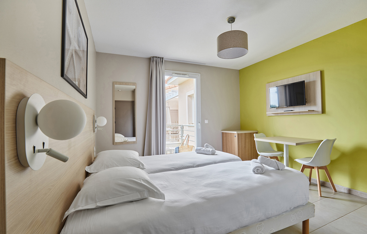 34 m² - 1 spálňa s manželskou posteľou alebo 2 samostatnými lôžkami, obývacia izba s kuchynským kútom a rozkladacím gaučom pre 2 osoby (možný aj typ "zásuvka"), sociálne zariadenie s vaňou, balkón alebo terasa