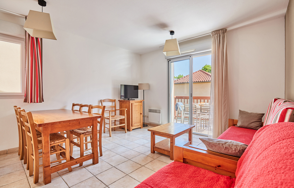 44 m² - 1 spálňa s manželskou posteľou, 1 spálňa s 2 samostatnými lôžkami, obývacia izba s kuchynským kútom a rozkladacím gaučom (typ zásuvka) a 1 samostatným lôžkom, kúpeľňa, oddelené WC