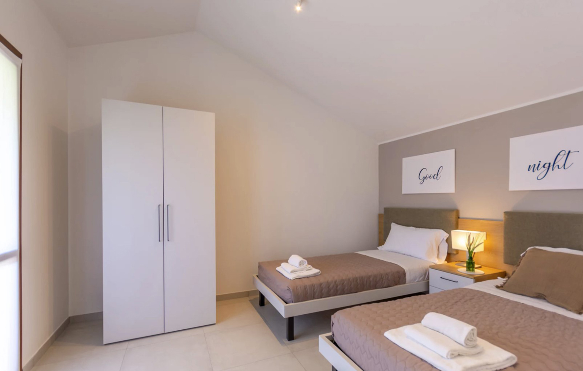 100 m² – polovica dvojpodlažnej vily; prízemie: 1 spálňa s manželskou posteľou, obývacia izba s kuchynským kútom, sociálne zariadenie so sprchou, veranda s vonkajším krbom a grilom, záhrada so súkromným bazénom; poschodie: 1 spálňa s manželskou posteľou, 1 spálňa s 2 samostatnými lôžkami alebo poschodovou posteľou, sociálne zariadenie so sprchou; 2 parkovacie miesta pri dome; na požiadanie možnosť 7. osoby na prístelke*