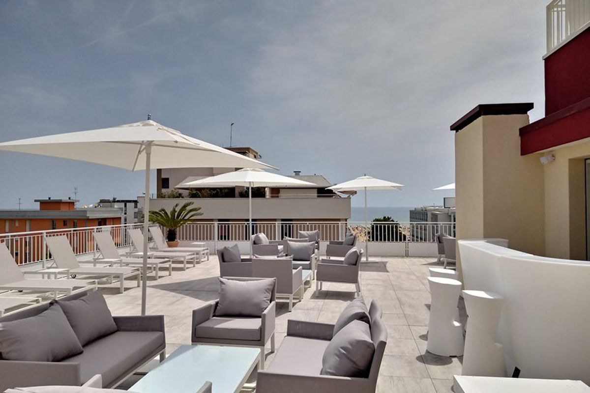 panoramatický strešný bazén s ležadlami a slnečníkmi, slnečná terasa, na privátnej pláži aj plážový servis (2 ležadlá + slnečník, prípadne 2 ležadlá + plážový altán / izba v cene); požičovňa bicyklov, osušiek pri bazéne*
