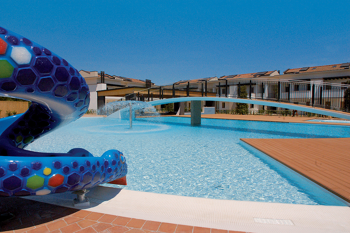bazén cca 400 m² s postupne sa zvažujúcim detským bazénom (cca 200 m²), vírivka (cca 100 m²), šmýkačkou a ležadlami