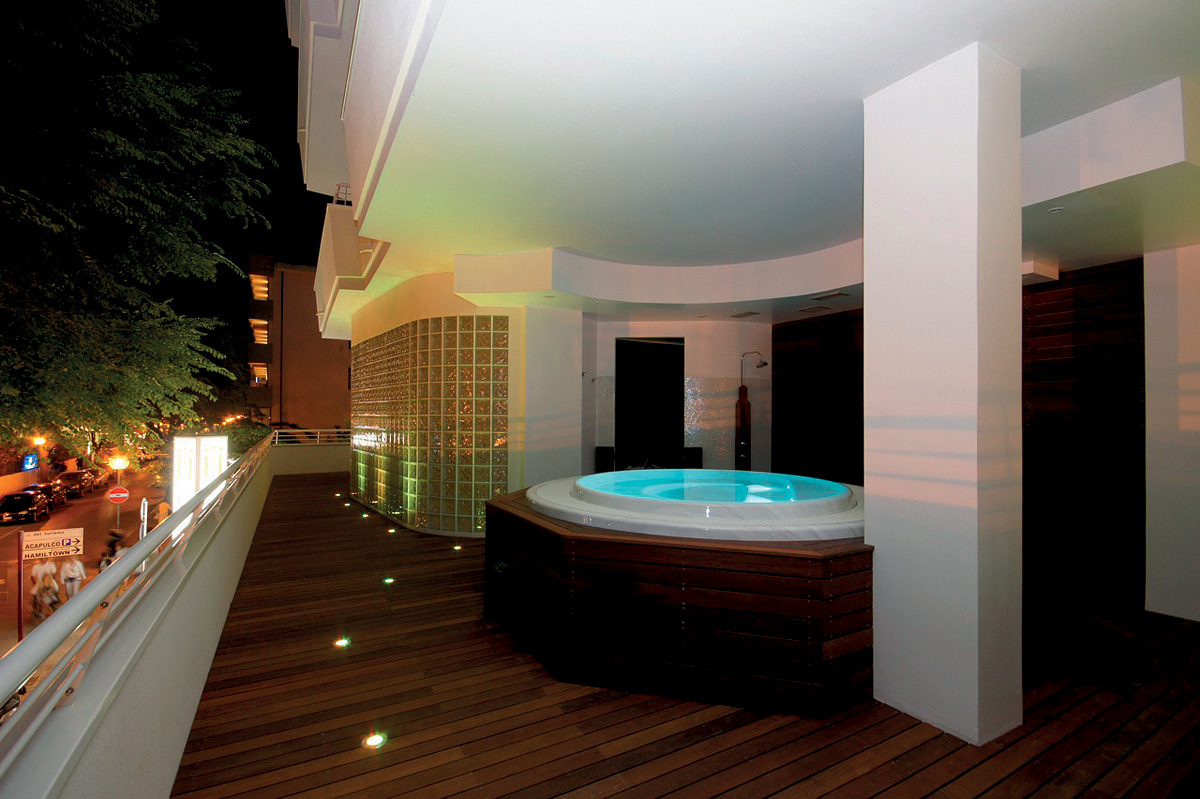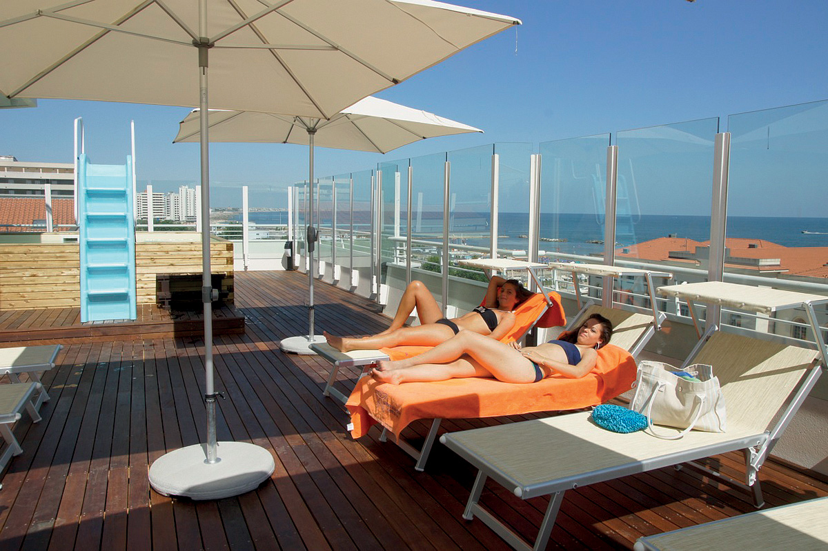 šport a relaxácia - malý strešný bazén (približne od konca mája do polovice septembra) so slnečníkmi* a ležadlami*, wellness centrum* (vírivka, fínska sauna, zážitkové sprchy, parný kúpeľ, relaxačná zóna), požičovňa bicyklov, plážový servis (1 slnečník a 2 ležadlá / izba v cene, na pláži vzdialenej 500 m od hotela)