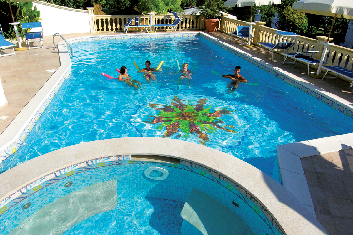 bazén s vírivkou až pre 8 osôb a ležadlami, plážový servis (1 slnečník a 2 ležadlá / izba v cene, od 2. radu) na pláži pri partnerskom hoteli Marechiaro vzdialenom 1,2 km
