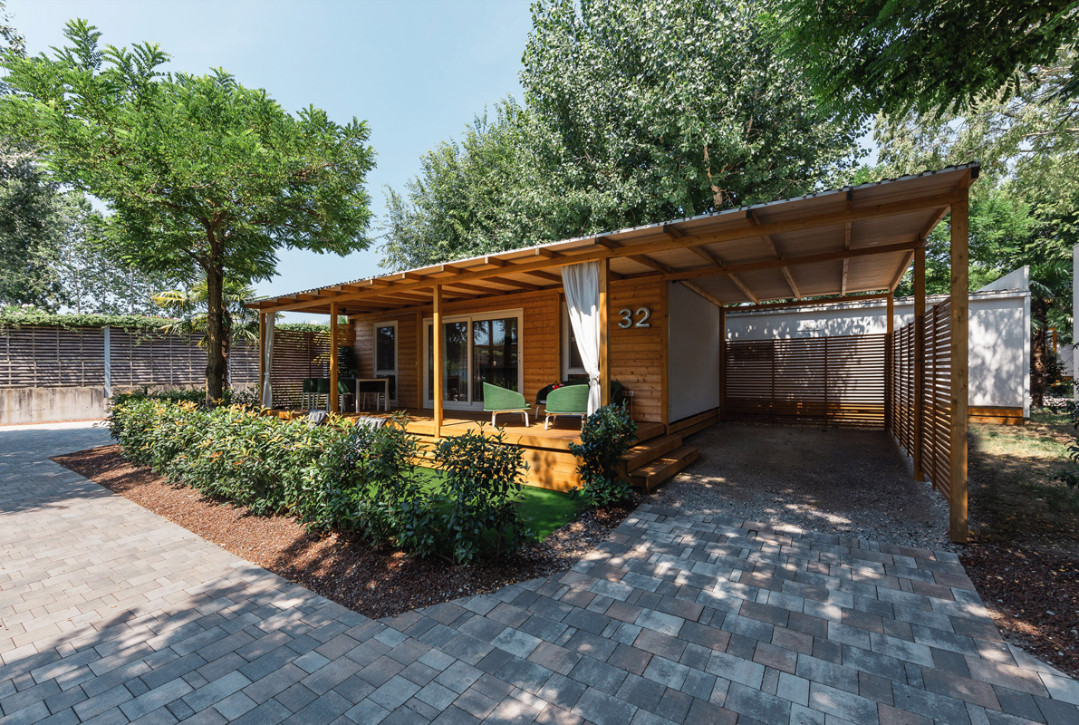 cottage Deluxe 4 - 32 m² - 2 spálne s manželskou posteľou, obytná časť s kuchynským kútom, 2x sociálne zariadenie so sprchou, krytá terasa so záhradným nábytkom, predzáhradka, parkovacie miesto
