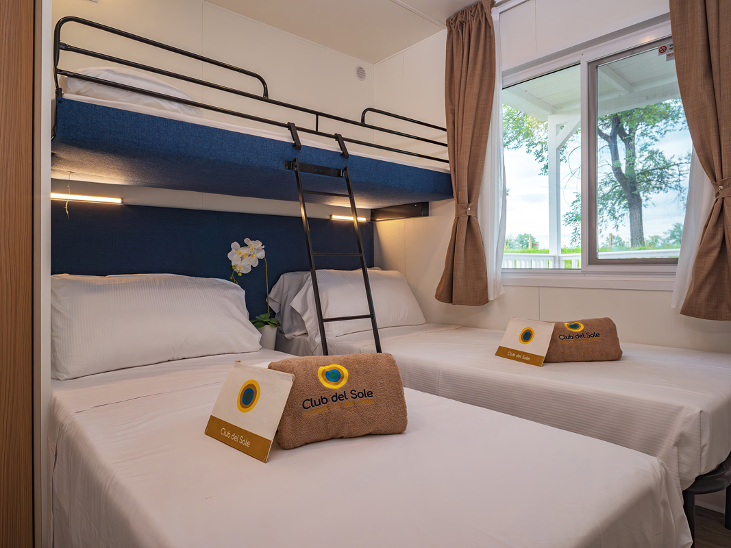mobilhome Deluxe 4+1 - 33 m² - spálňa s manželskou posteľou, spálňa s 2 samostatnými lôžkami a zaveseným lôžkom (pre dieťa do nedovŕšených 10 rokov), obytná časť s kuchynským kútom, 2x sociálne zariadenie so sprchou, krytá uzatvárateľná terasa so záhradným nábytkom