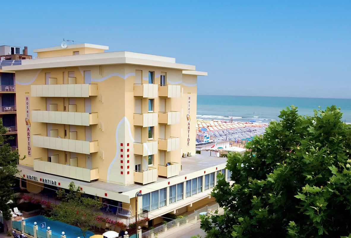 jednoduchý hotel s bazénom priamo pri plážovej promenáde