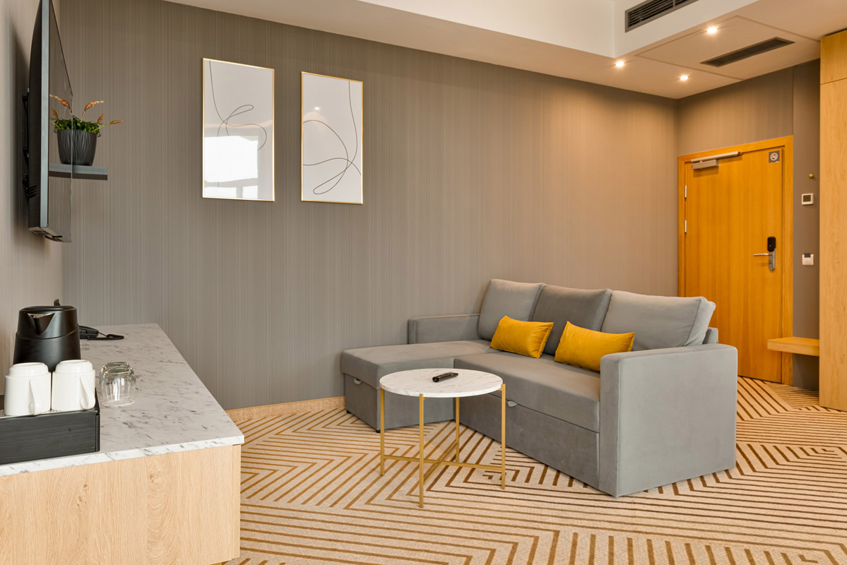 26 až 28 m² – izba s manželskou posteľou 180x200 cm alebo oddeliteľnými lôžkami a rozkladacím gaučom formou prístelky pre max. 1 osobu (šírka 120 cm), sociálne zariadenie