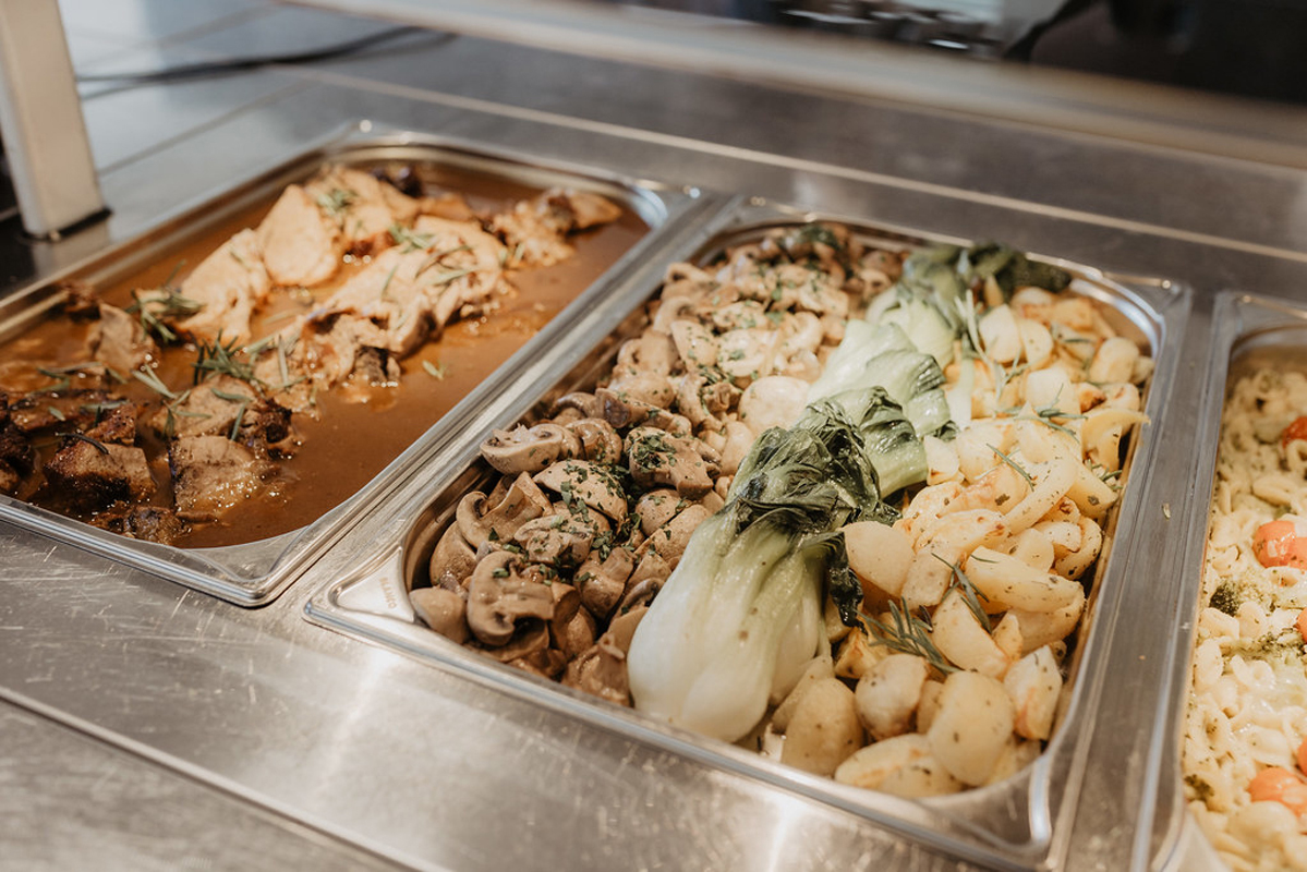 formou bufetu s výberom hlavného jedla s prílohou, predjedla alebo polievky, šaláty a dezerty formou bufetu, nápoje za poplatok