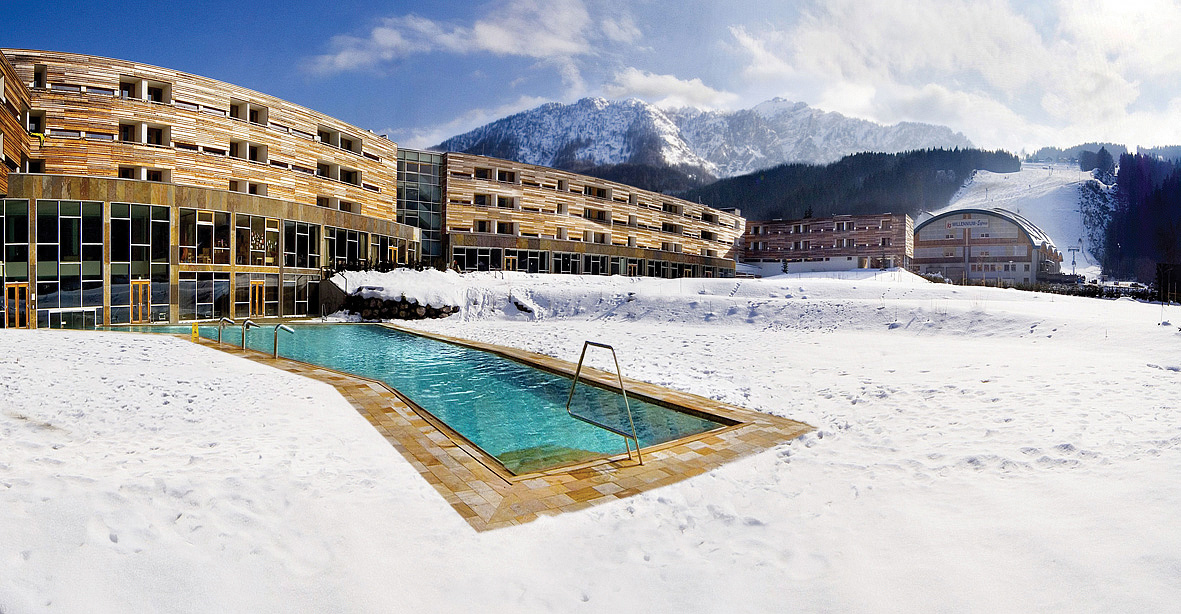 vybavenosť a služby - recepcia / lobby s otvoreným krbom a barom, reštaurácia vyhradená pre hotelových hostí / zimná záhrada, detská herňa s animačným programom ( pre deti od 5 do 14 rokov; 5 až 6x týždenne), 3x seminárna miestnosť až pre 320 osôb, slnečná terasa s posedením a lehátkami, uvítací prípitok, wi-fi pripojenie k internetu, úschovňa lyží a lyžiarskych topánok, 3x výťah, vyhradené parkovisko, garážové miesto*, požičovňa lyžiarskeho a snowboardového vybavenia