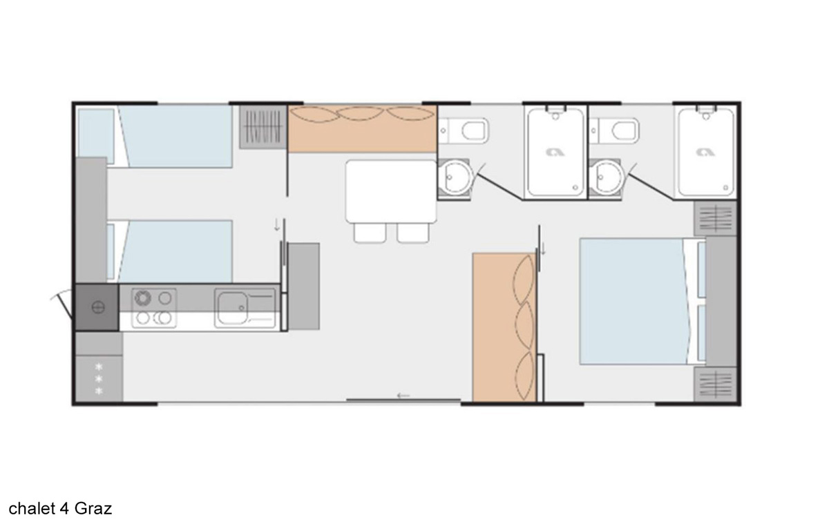 57 m² - 1 spálňa s manželskou posteľou, spálňa s 2 samostatnými lôžkami alebo poschodovou posteľou, obývacia izba s gaučom a kuchynským kútom, 2× sociálne zariadenie, 1× oddelené WC, terasa s predzáhradkou, súkromné parkovacie státie (1 miesto / apartmán)
