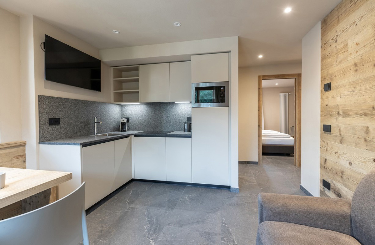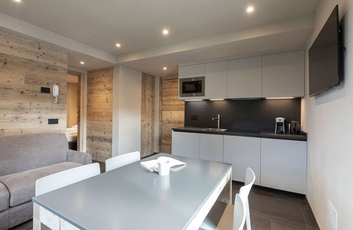 40 m² - 1 spálňa s manželskou posteľou alebo 2 samostatnými lôžkami, obývacia izba s kuchynským kútom a rozkladacím gaučom pre 1 osobu, sociálne zariadenie so sprchou, terasa; apartmán na prízemí