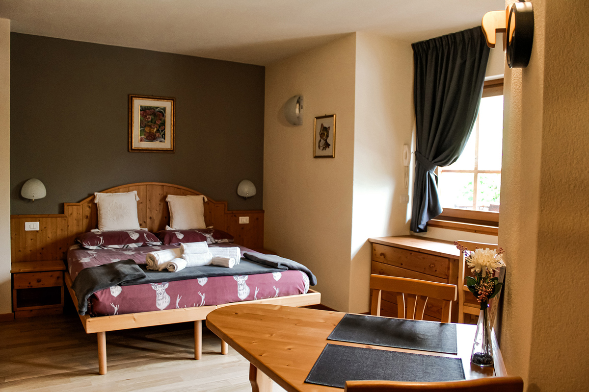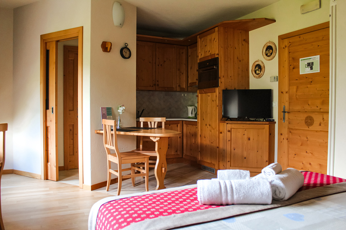 42 m² - 1 spálňa s manželskou posteľou, obývacia izba s kuchynským kútom a rozkladacím gaučom pre 2 osoby, sociálne zariadenie so sprchou, balkón; jeden apartmán je menší a má kuchyňu vo vyvýšenom podlaží prístupnú po schodoch