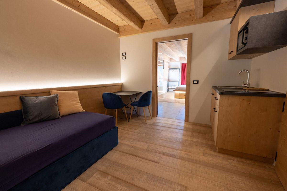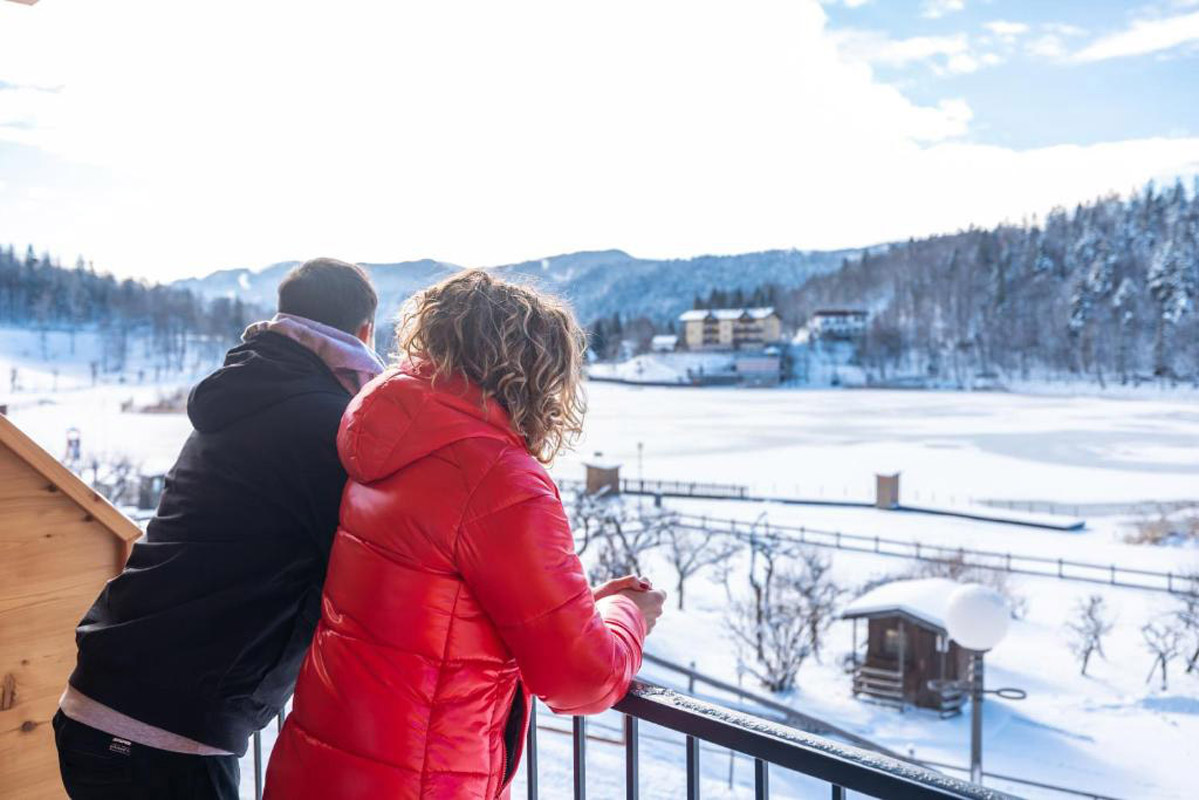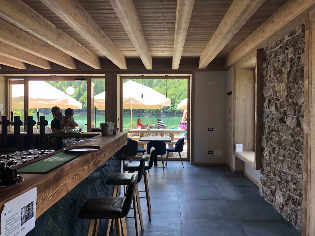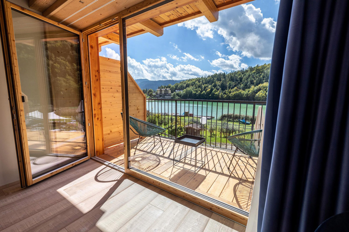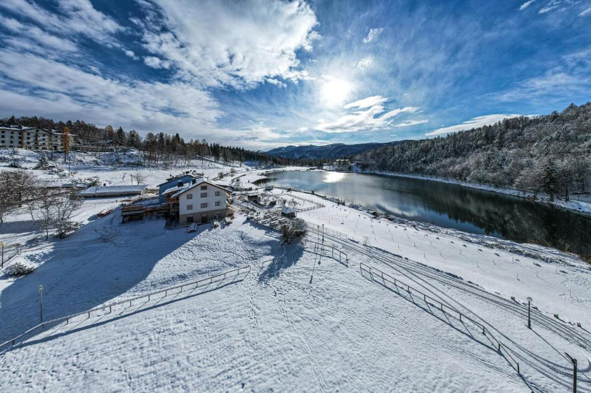 krasne architektonicky riešený malý aparthotel s romantickou polohou na brehu jazera Lavarone