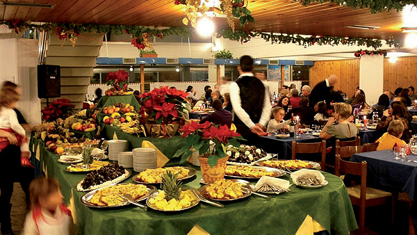 formou bufetu studených predjedál, 3 teplých predjedál, 3 hlavných jedál, príloh, šalátov, zeleniny, dezert; nápoje za poplatok