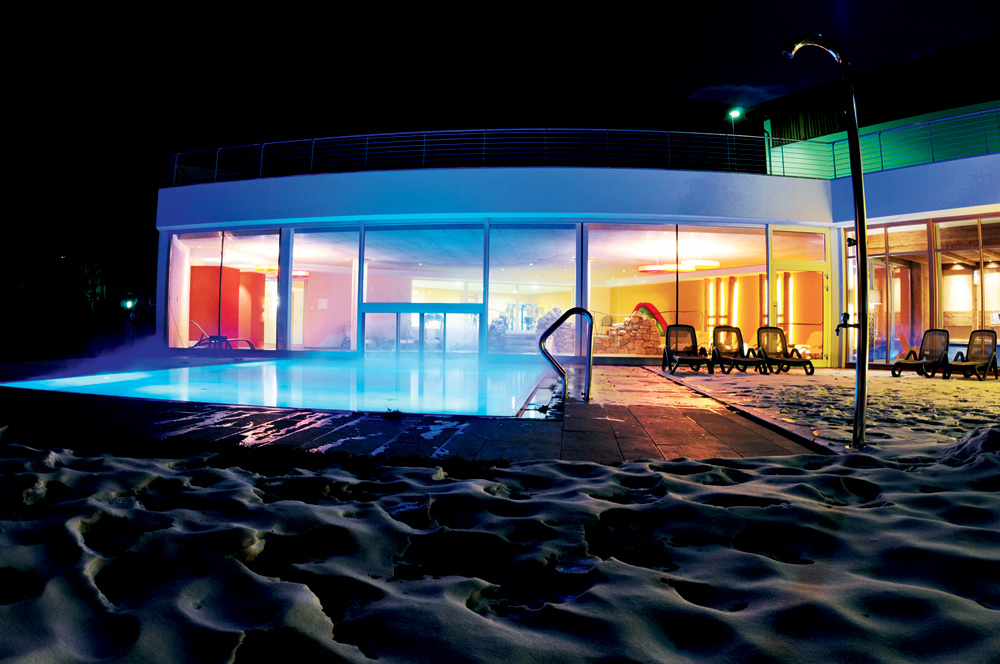 čiastočne krytý a čiastočne vonkajší vyhrievaný bazén so slanou vodou, protiprúdom a lehátkami, detský bazénik so šmýkľavkou, vírivka * pre 1 osobu, vírivka až pre 4 osoby, sauna, para, multifunkčná sprcha, horizontálne solárium *, relaxačný kútik s lehátkami, kneippov chodník, masáže *, menšia posilňovňa; v rámci relaxačného centra sú zdarma ponúkané tiež bylinkové čaje