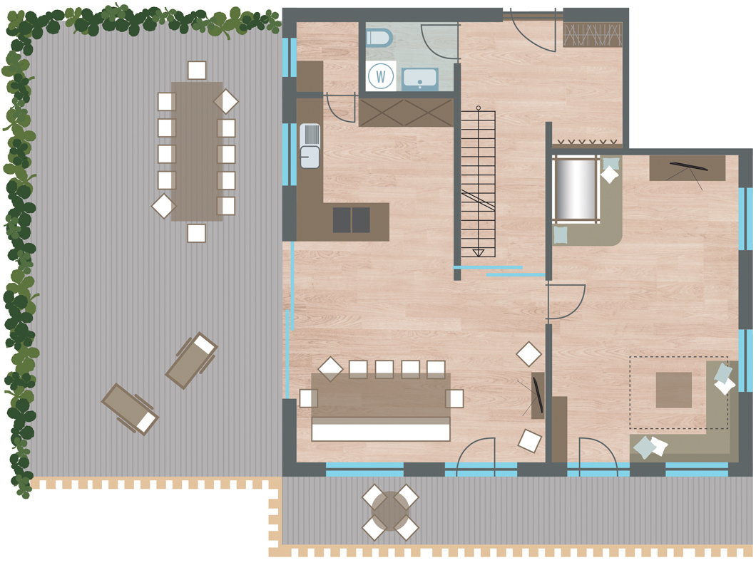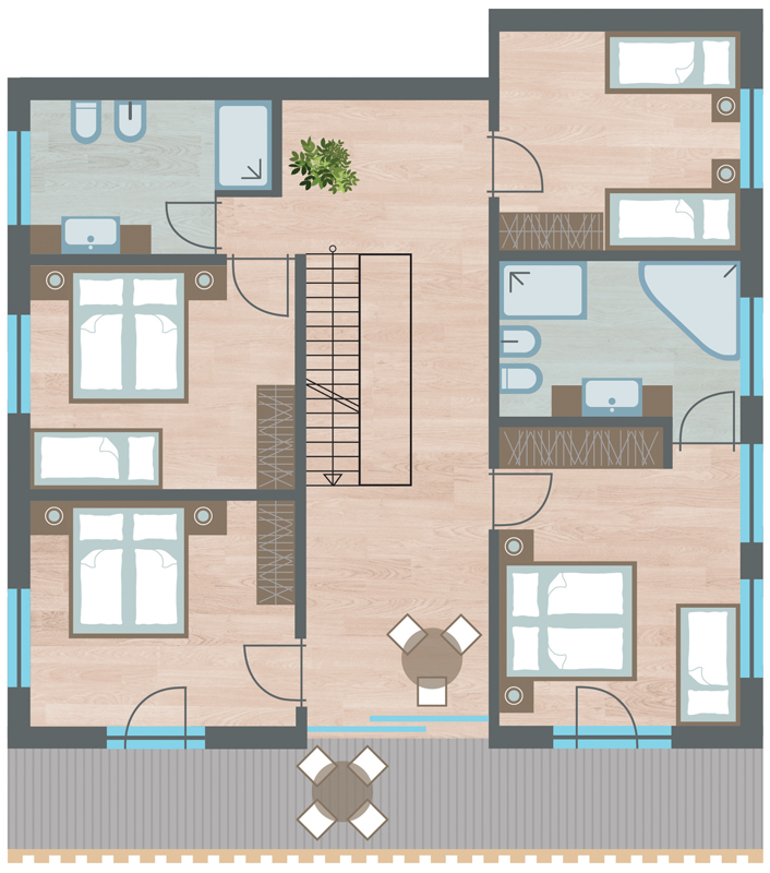 Penthouse Zirm 13 - 165 m² - 1. podlažie apartmánu: obývacia izba s kuchynským kútom a prípadne rozkladacím gaučom pre 1 osobu, 1 spoločenská miestsnosť s krbom a rozkladacím gaučom pre 2 osoby, samostatné WC, veľká terasa so vstupom na záhradu; 2. podlažie apartmánu: 1 spálňa s manželskou posteľou, 2 spálne s manželskou posteľou a 1 samostatným lôžkom, 1 spálňa s 2 samostatnými lôžkami, 1x sociálne zariadenie so sprchou, 1x sociálne zariadenie so sprchou a vaňou, balkón