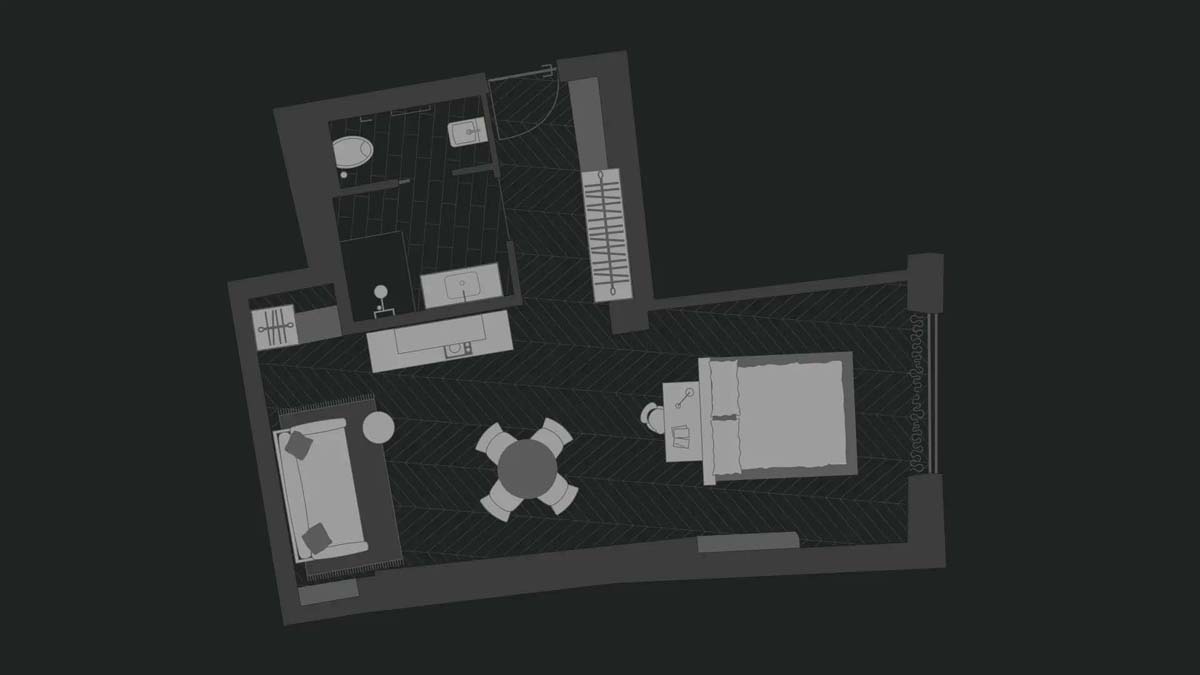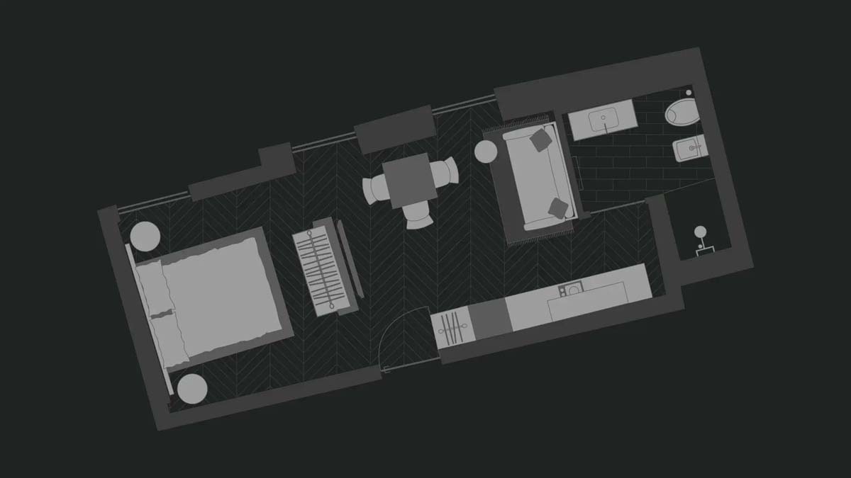 40 m² – obývacia izba s kuchynským kútom s čiastočne oddelenou manželskou posteľou, sociálne zariadenie