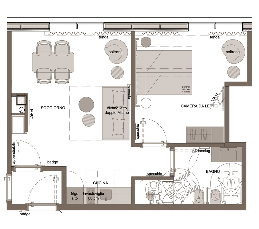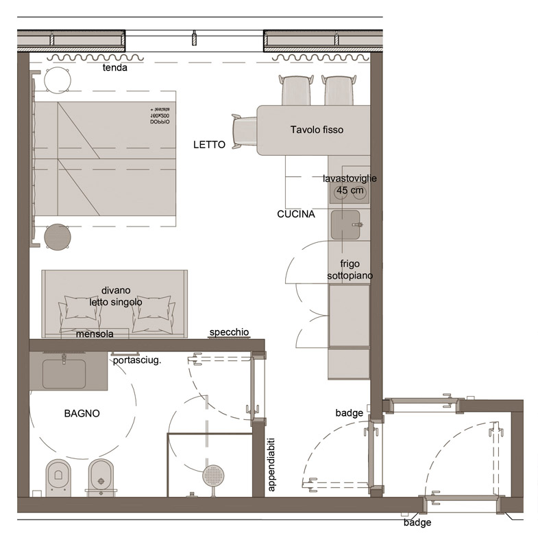 1 spálňa s manželskou posteľou oddelená od obývacej časti posuvnou stenou, obývacia izba s kuchynským kútom a rozkladacou pohovkou pre 1 alebo 2 osoby, sociálne zariadenie so sprchou