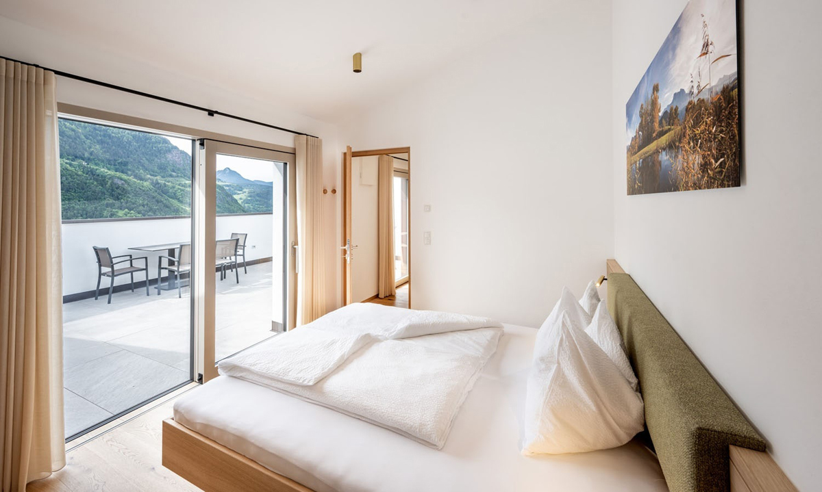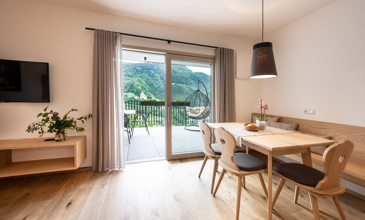 trilo 4 Vernatsch - 57 m² - 2x spálňa s manželskou posteľou a vlastným sociálnym zariadením, obývacia izba s kuchynským kútom, 1x balkón, veľká terasa (17 m²)