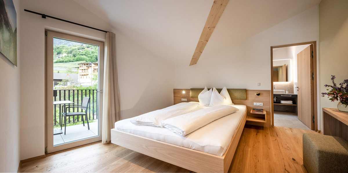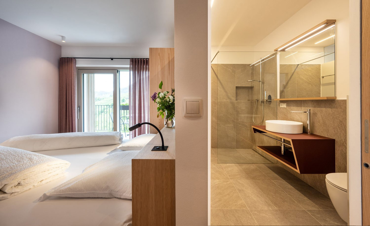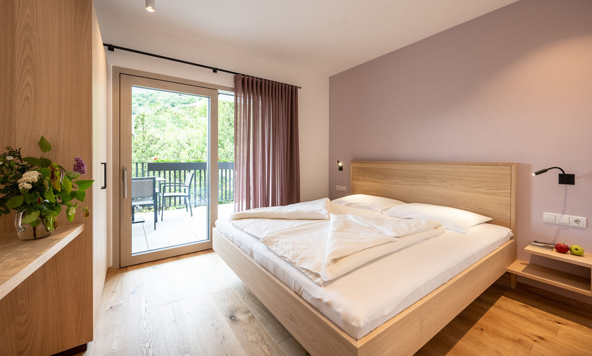 trilo 6 Blauburguder - 65m² - 2x spálňa s manželskou posteľou a vlastným sociálnym zariadením, obývacia izba s kuchynským kútom a rozkladacím gaučom pre 2 osoby, balkón, veľká terasa (20 m²)