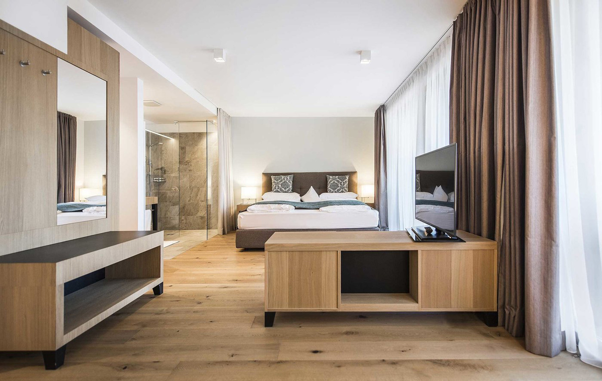 Junior Suite Dolomiten 2/3/4 - 36 m² - izba s manželskou posteľou a rozkladacím gaučom pre 2 osoby, sociálne zariadenie so sprchou, samostatné WC, balkón