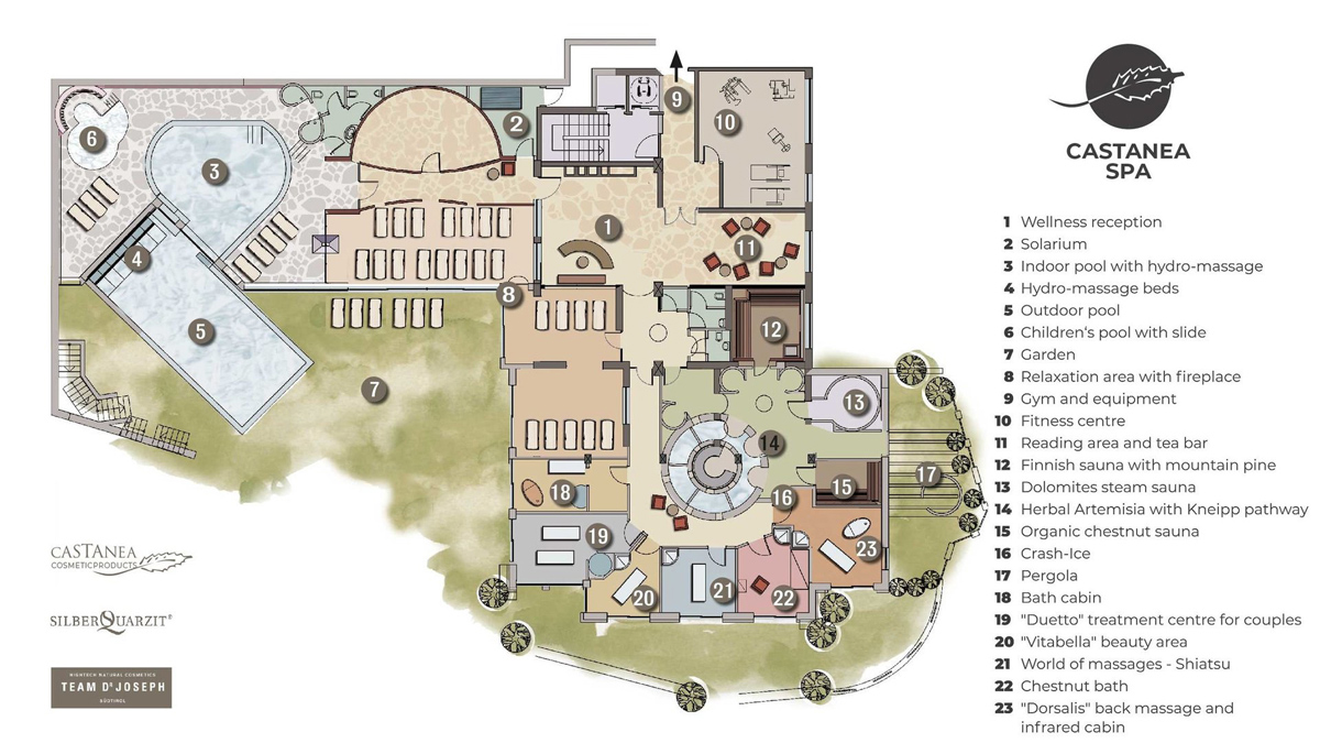 vonkajší vyhrievaný bazén s vírivkou a bazén okrúhleho tvaru s vírivkou (spolu 100 m²), detský bazénik so šmykľavkou, fínska sauna#, biosauna#, para#, Kneippov chodník#, 3× relaxačný kútik# s ležadlami, posilňovňa#, masáže*#, kozmetické služby*#, stolný tenis, stolný futbal; služby označené # môžu využívať iba osoby od 18 rokov