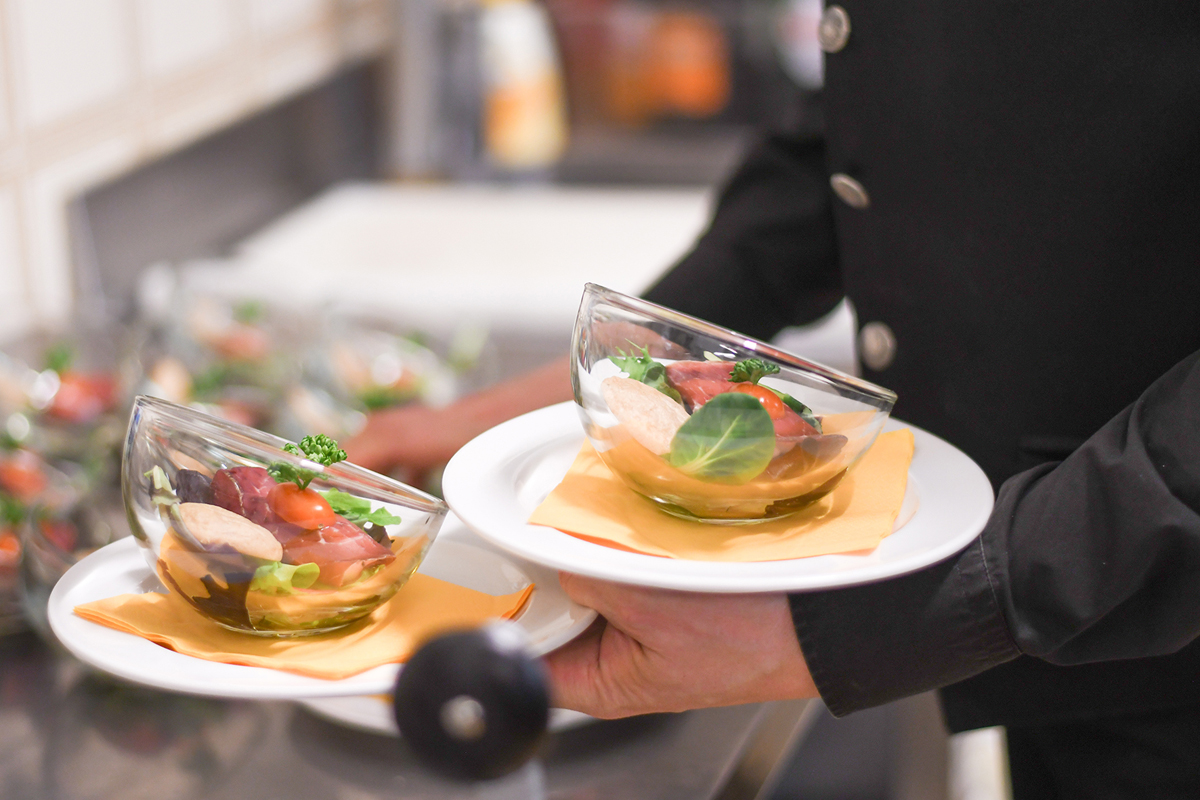 večera - servírované menu (4 chody) – polievka, teplé predjedlo, hlavné jedlo (možnosť výberu vegetariánskeho alebo mäsového) a dezert, ovocný a šalátový bufet, nápoje za poplatok